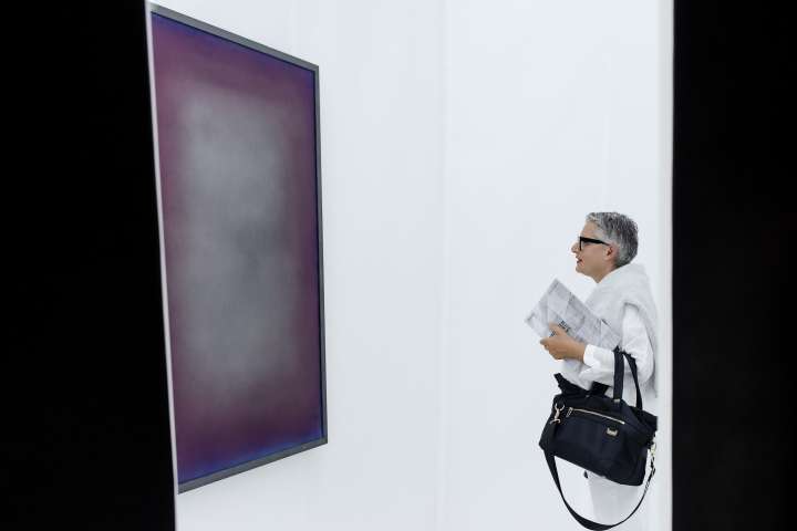 Eine Besucherin betrachtet die Installation im Feld- Haus.